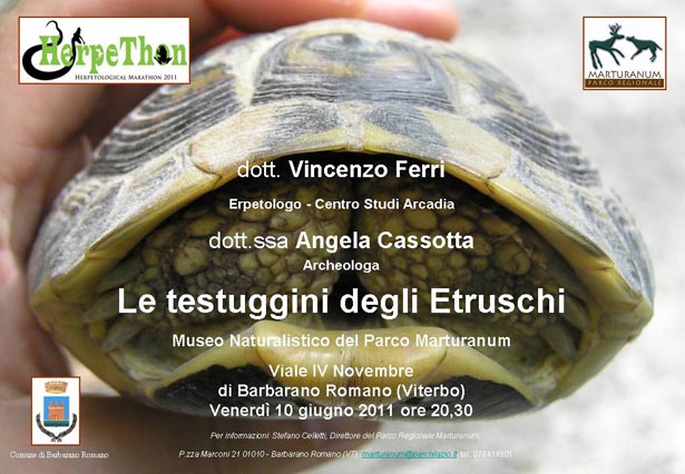 L'iniziativa HerpeThon, Hepetological Marathon, prevede una serie di conferenze divulgative a carattere erpetologico in tutta Italia. L'obiettivo è di portare alla ribalta animali spesso poco noti gli Anfibi ed i Rettili. Nonostante siano fra i più importanti rappresentanti della biodiversità animale, e spesso siano anche rilevanti indicatori ambientali, questi Vertebrati sono spesso oggetto di vere e proprie persecuzioni, nonchè di catture e commercio per uso amatoriale e per l'alimentazione. Tra le 34 conferenze previste l'appuntamento presso il Parco Marturanum alle 20:30 "Le Testuggini degli etruschi". Alla conferenza è legata l'iniziativa "Alla ricerca delle testuggini di terra" prevista domenica 12 giugno, con partenza dal Centro Visite alle 9:00 in cui verrà svolta un'attività pratica, sul campo, di osservazione, monitoraggio e ricerca delle testuggini terrestri nel loro ambiente naturale.