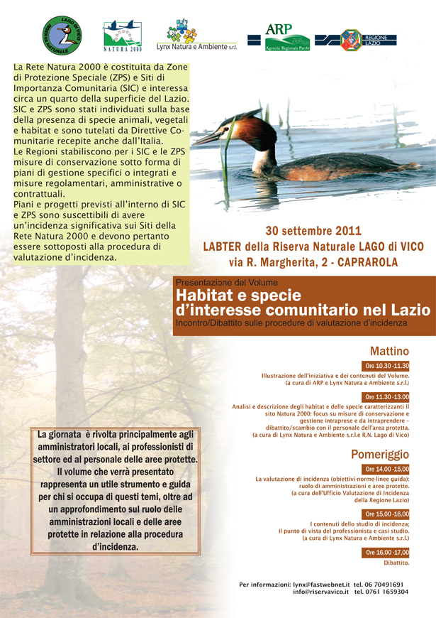 iIl 30 settembre alle ore 10,30 presso i locali del LABTER della Riserva Naturale "Lago di Vico " a Caprarola verrà presentato il volume "Habitat e specie di interesse comunitario nel Lazio". La giornata proseguirà con un incontro/dibattito sulle procedure di valutazione di incidenza.