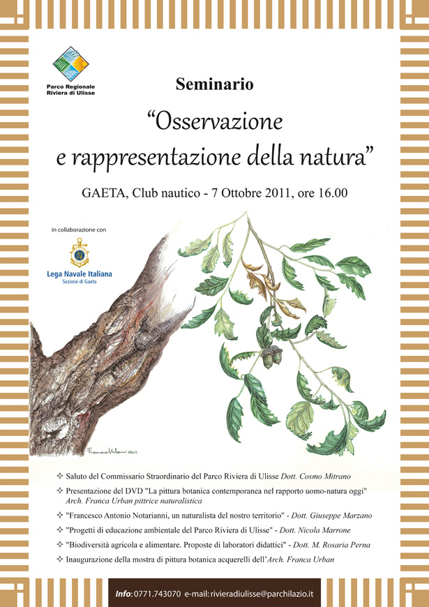 Venerdì 7 ottobre 2011 alle ore 16.00, presso i locali del Club nautico di Gaeta, il parco regionale Riviera di Ulisse organizza una seminario intitolato: "Osservazione e rappresentazione della natura"