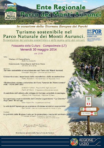 L'Ente Parco in occasione della Giornata Europea dei Parchi organizza un convegno sul turismo sostenibile nel Parco Naturale dei Monti Aurunci il giorno 30 maggio '14 a Campodimele.