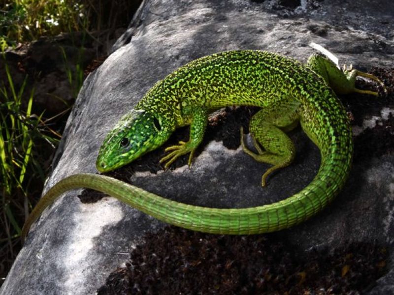 Camminando lungo un muretto a secco o su un prato al limitare del bosco è possibile imbattersi in delle grandi lucertole verdi, si tratta del ramarro, il più grande rappresentante della famiglia dei Lacertidi della Regione Lazio. Con maschi che possono arrivare a 35 cm di lunghezza (di cui 2/3 rappresentati dalla coda) il ramarro supera di gran lunga le dimensioni di una lucertola, inoltre il colore verde brillante caratteristico degli esemplari di sesso maschile risulta inconfondibile. L'epiteto specifico "bilineata" deriva dal pattern dorsale tipico dei giovani e delle femmine adulte, costituito da due bande trasversali che scorrono parallele dalla coda fino al collo. Il ramarro predilige ambienti ecotonali (vale a dire di transizione) come il confine fra prato e macchia, su versanti aperti e soleggiati ed in presenza di rocce ed arbusti, generalmente in aree con scarsa presenza umana. La sua dieta è molto varia e si basa prevalentemente su artropodi, non disdegnando però l'integrazione con frutta e piccoli vertebrati (come giovani serpenti e lucertole o pulli di uccelli). La specie risulta purtroppo in diminuzione in Italia, probabilmente a causa della frammentazione degli habitat, dell'uso di pesticidi e delle attività antropiche, che a causa della tendenza del ramarro a sfruttare il calore dell'asfalto durante le ore serali (tigmotermia) non di rado porta questi animali ad essere vittime del traffico stradale. In foto un bel maschio fotografato nel Parco dei Monti Simbruini.