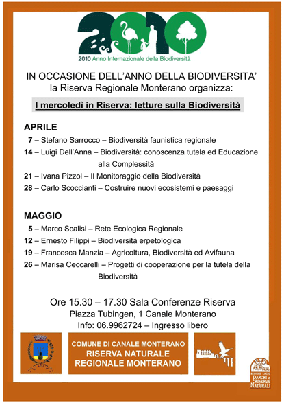 Mercoledì 5 maggio 2010 si terrà, presso la Riserva Monterano, il quinto degli appuntamenti del ciclo "I mercoledì in Riserva: letture sulla Biodiversità" a cura di Marco Scalisi (ARP) con il seminario dal titolo "Rete Ecologica Regionale". Ore 15.30 - 17.30 presso la Sala Conferenze della Riserva Monterano - Piazza Tubingen, 1 Canale Monterano Info: 06.9962724 – Ingresso libero.