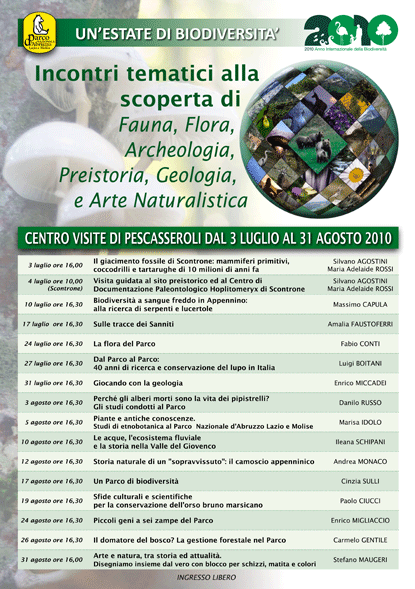Giovedì 12 agosto 2010 alle ore16.30, presso il centro visite di Pescasseroli, si terrà uno degli incontri tematici del ciclo "un'estate di biodiversità" a cura di Andrea Monaco con il seminario dal titolo Storia naturale di un "sopravvvisuto": il camoscio appenninico.