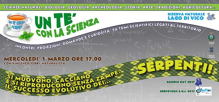 Il terzo appuntamento del "Tè con la Scienza" cade in concomitanza con il secondo Darwin Day della Riserva Regionale Lago di Vico e apre la maratona erpetologica nazionale HerpeThon 2017 della Societas Herpetologica Italica.