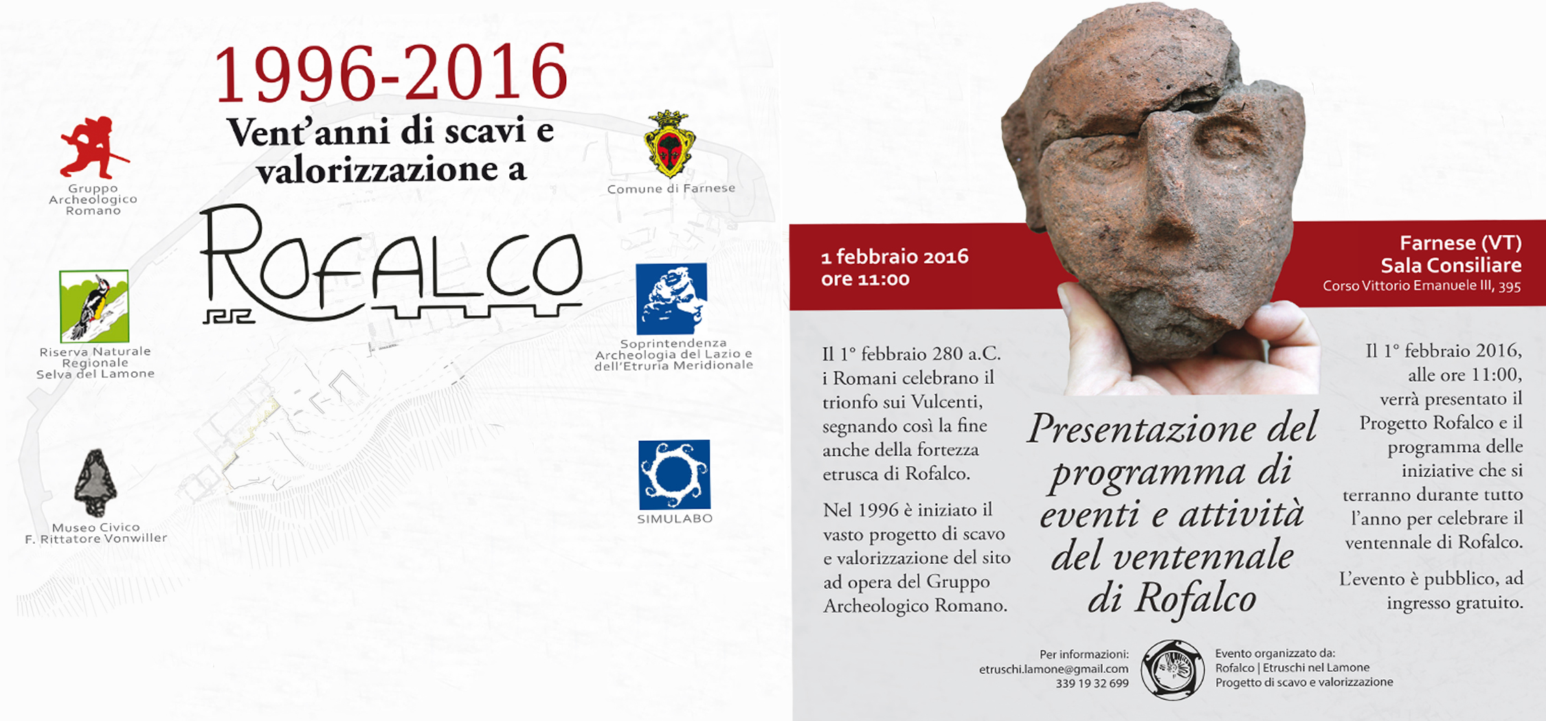 In occasione del ventennale degli scavi archeologici del sito etrusco di Rofalco, a cura del G.A.R. (Gruppo Archeologico Romano-1996/2016), verrà presentato un programma di eventi ed attività. La data di questo evento non è stata scelta casualmente, infatti, proprio il 1° febbraio del 280 A.C. i romani celebrarono il trionfo sui Vulcenti, segnando così la fine della fortezza etrusca di Rofalco.
