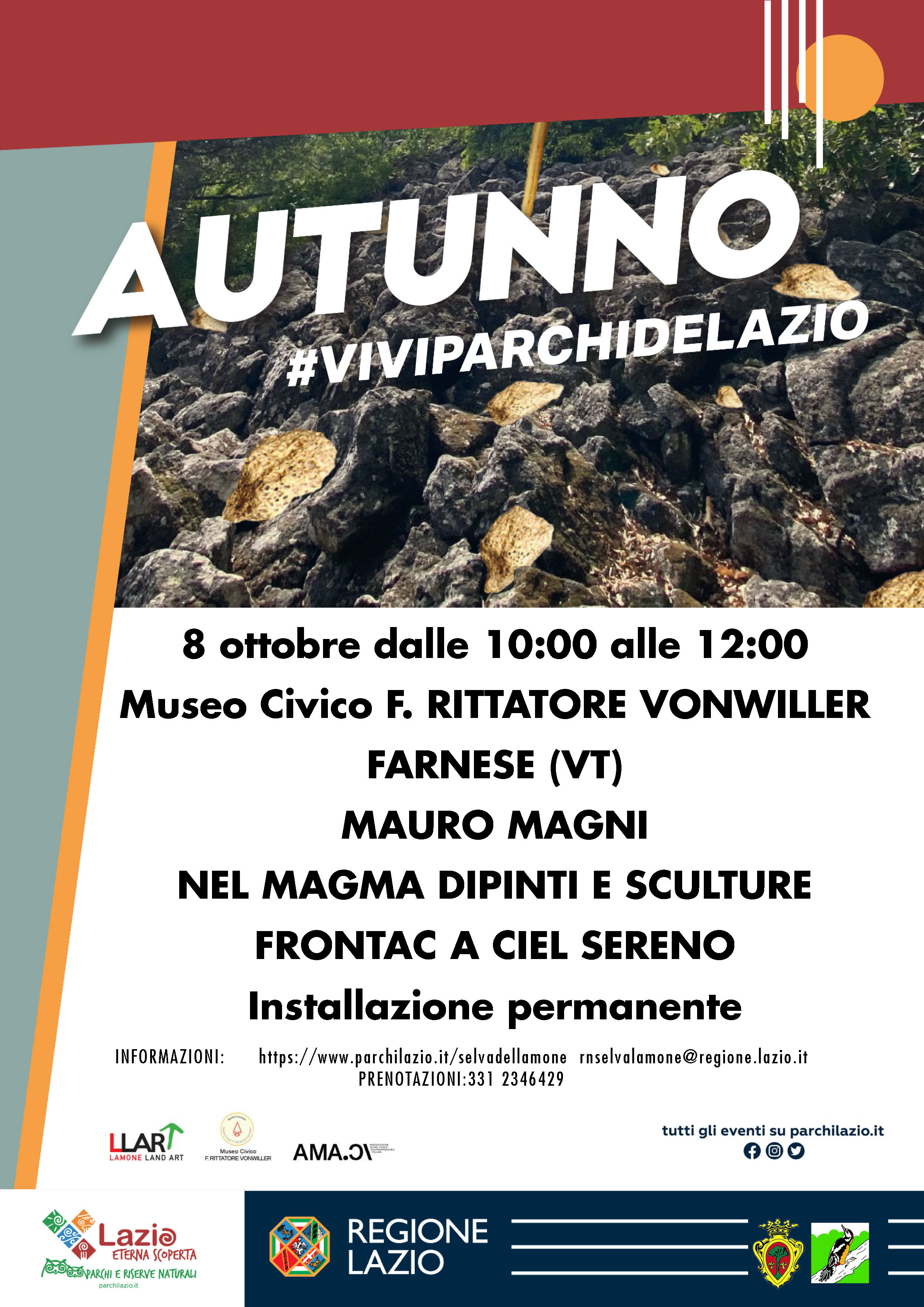 ore 10.00: inaugurazione di NEL MAGMA, mostra a cura di Caterina Pisu. I dipinti e piccole opere scultoree di Mauro Magni raccontano il rapporto dell’Uomo con la Natura ed in particolare con l’elemento fuoco, riportandoci alle caratteristiche della Selva del Lamone e alla natura vulcanica di questo luogo suggestivo del comune di Farnese (VT). Questo sito si presenta quindi come posto ideale per accogliere alcuni “Vulcani” di Magni, soggetti protagonisti di un ciclo pittorico - figlio dell’originaria ricerca sulla “Montagna” - unitamente a sculture ceramiche simbolo dell’unione dei quattro elementi naturali: un dialogo tra terra fuoco acqua e aria e creatività. della Nova. La mostra Nel magma si svolge all’interno nel Museo Civico F. Rittatore Vonwiller.