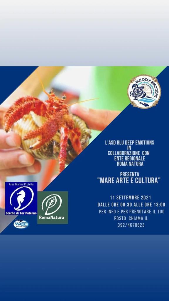 L’11 settembre dalle ore 08:30 alle ore 13:00 alla Casa del Mare di Ostia sede dell'Amp Secche di Tor Paterno, gestita dall'Ente Regionale RomaNatura l'associazione Blu Deep Emotions in collaborazione con RomaNatura presentano l'evento: Mare, Arte e Cultura!