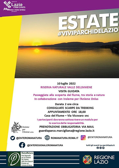 Partendo dalla Casa del Fiume ci si dirige in discesa percorrendo il sentiero natura fino ad arrivare all'affaccio sul fiume dove rimanendo in silenzio si possono avvistare uccelli acquatici e ammirare la vegetazione ripariale. Si risale il percorso fino ai resti di una Villa Romana. Passeggiata lungo un facile e piacevole percorso ad anello adatto a tutti. Si consigliano scarpe comode. Durata due ore circa. In collaborazione con Insieme per l’Aniene Onlus. Appuntamento alle ore 18.00 presso la Casa del Fiume – via Vicovaro snc. Prenotazione obbligatoria via mail: guardiaparco.marcigliana@regione.lazio.it