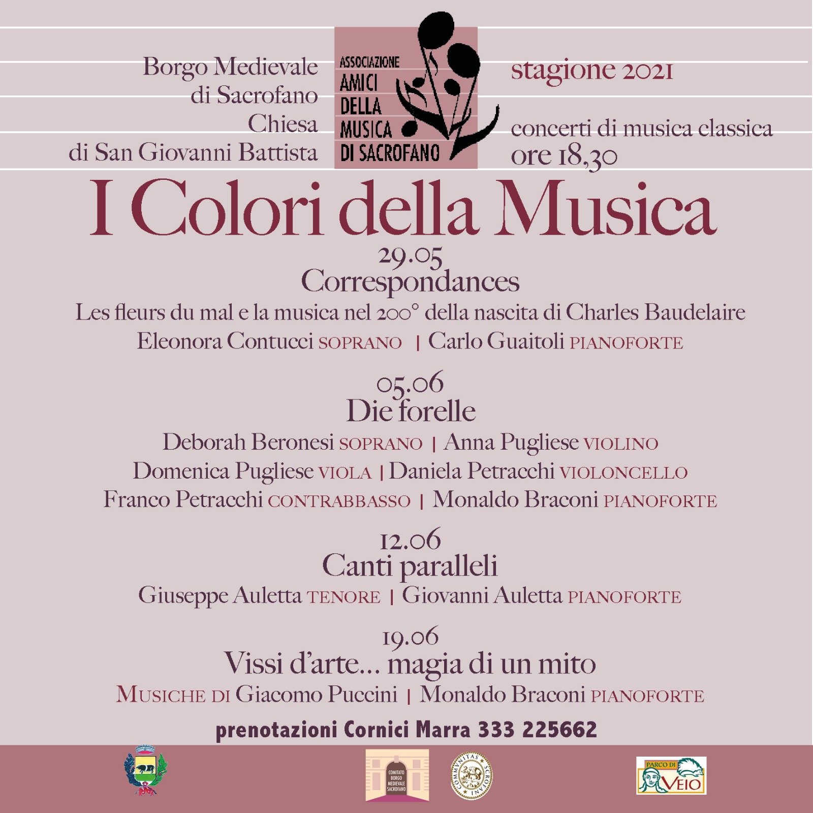 Con il Patrocinio del Parco di Veio inizia il 29 maggio a Sacrofano la rassegna “I colori della Musica” una serie di concerti di musica da camera classica ad opera della Associazione “Amici della Musica di Sacrofano”. I concerti si svolgeranno nella chiesa di San Giovanni Battista, al centro storico di Sacrofano, il 29 maggio e il 5, 12 e 19 giugno alle ore 18,30. Per informazioni: 347 104 2653, mail: amicidellamusica.sacrofano@gmail.com