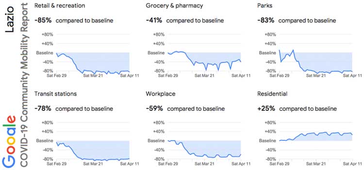 Raccoglie cioè in forma anonima dai nostri dispositivi, cellulari e tablet soprattutto, i dati sulla mobilità delle persone: per il nostro Paese sono disponibili i dati regione per regione.