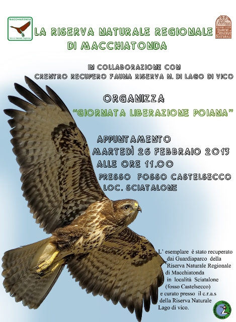 Il giorno 26 febbraio 2013 alle ore 11.00 presso il fosso Castelsecco, in Loc. Sciatalone nella Riserva Naturale Regionale di Macchiatonda, verrà liberata uno splendido esemplare di poiana "Buteo buteo", recuperata dai Guardiaparco della stessa Riserva e curata presso il Centro Recupero Fauna della Riserva Naturale Regionale Lago di Vico.