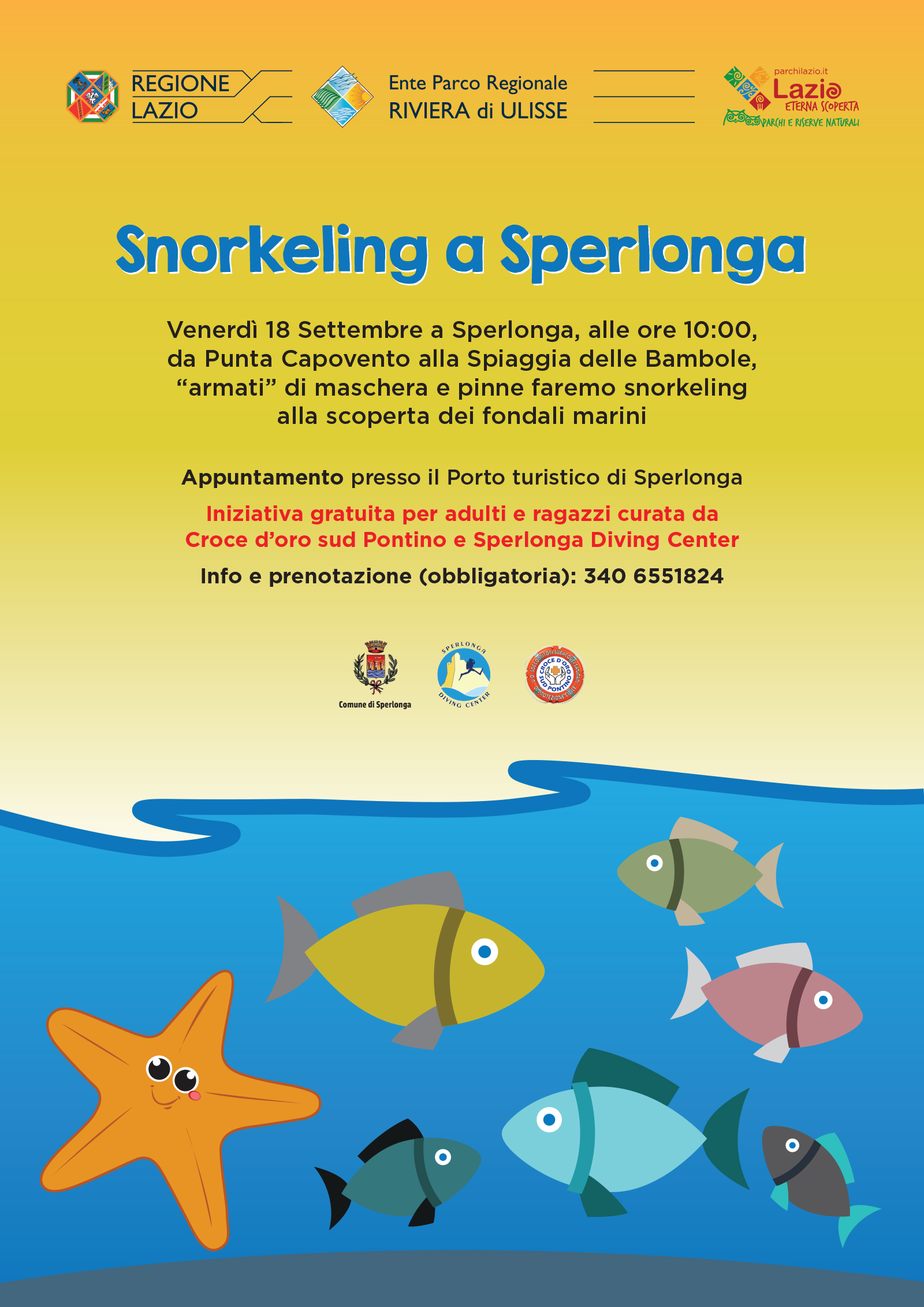 Domani, venerdì 18 Settembre alle ore 10:00, a Sperlonga, da Punta Capovento alla Spiaggia delle Bambole, “armati” di maschera e pinne faremo snorkeling alla scoperta dei fondali marini.